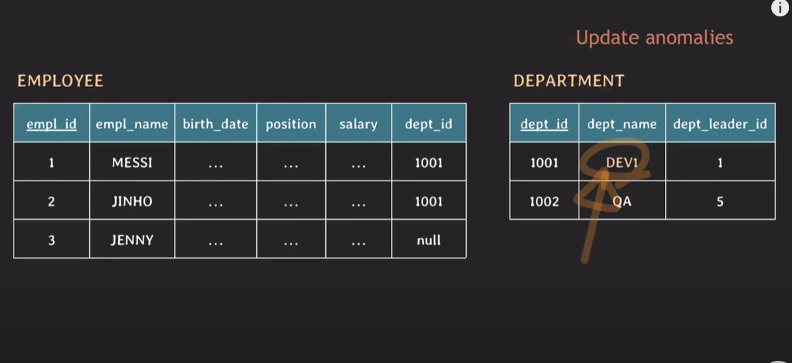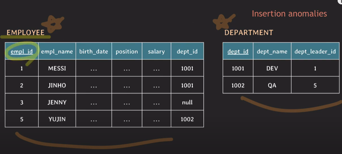 2. null 값 많이 쓰이게 됨. ( 임직원 없는 즉 부서만 입력시 혹은 반대 )