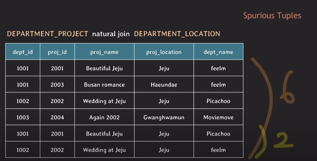 사진과 같이 가짜 튜플 2개가 생성됨. (proj_location으로 조인을 맺어 dept_name이 여러개여서)