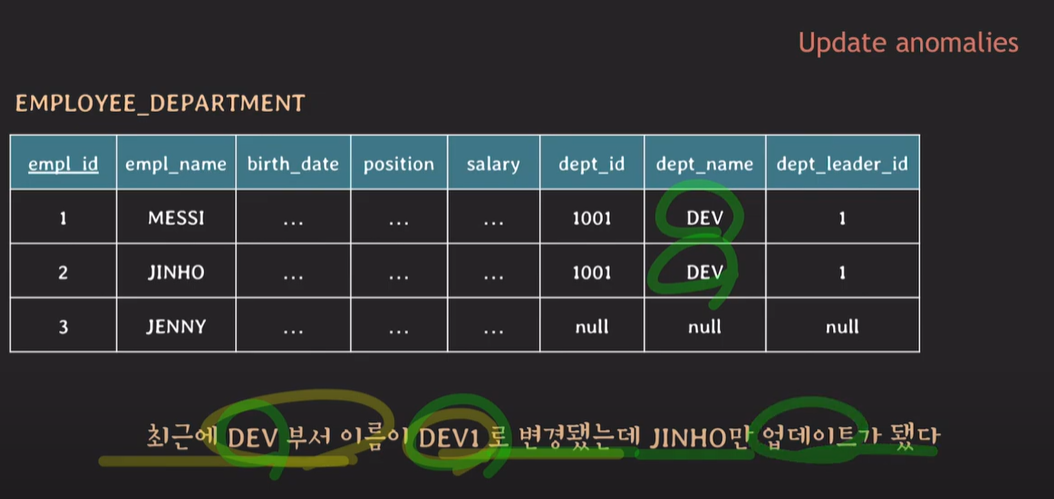 - 중복된 데이터가 여러 군데 존재할 때, 하나만 수정하면 데이터 불일치 발생