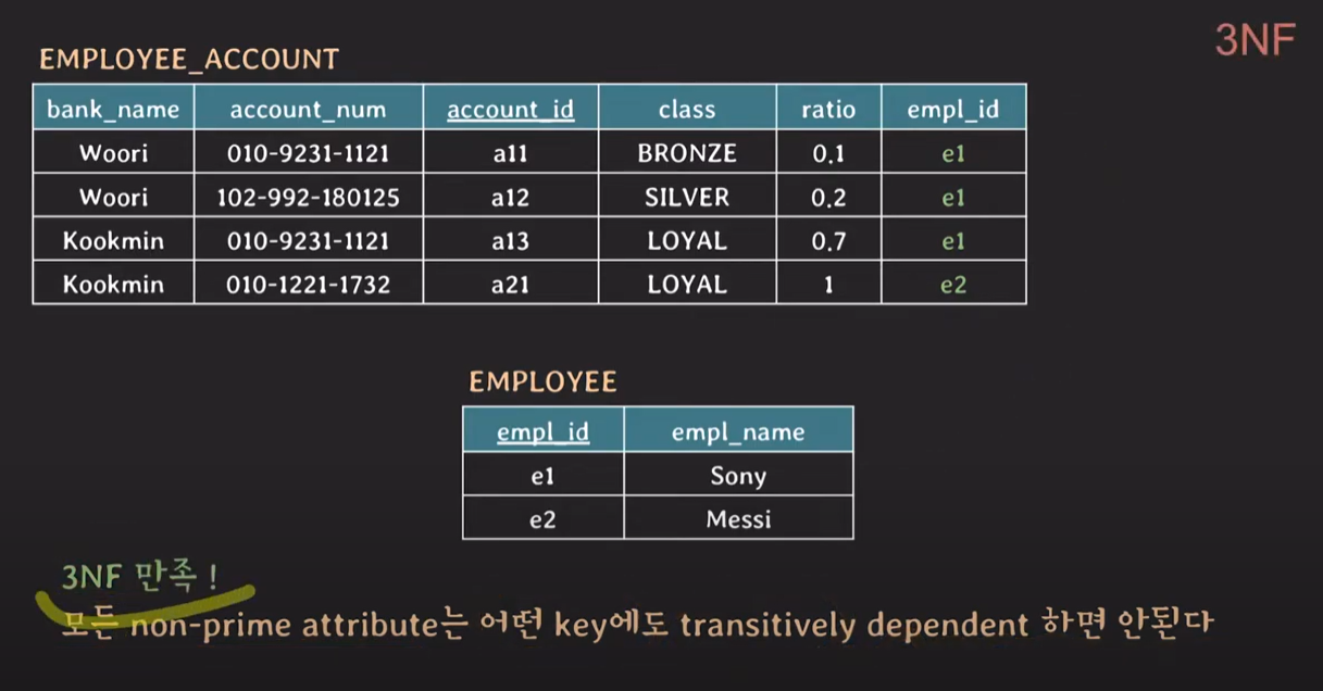 | 3NF | 모든 non-prime 속성은 후보키에 대해 이행 종속(transitive FD)되지 않아야 함 |