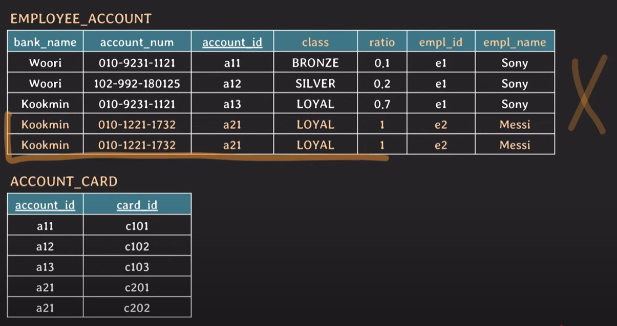 - 예시: {account_id , card_id} 복합키가 fully functionally dependent 하지 않다