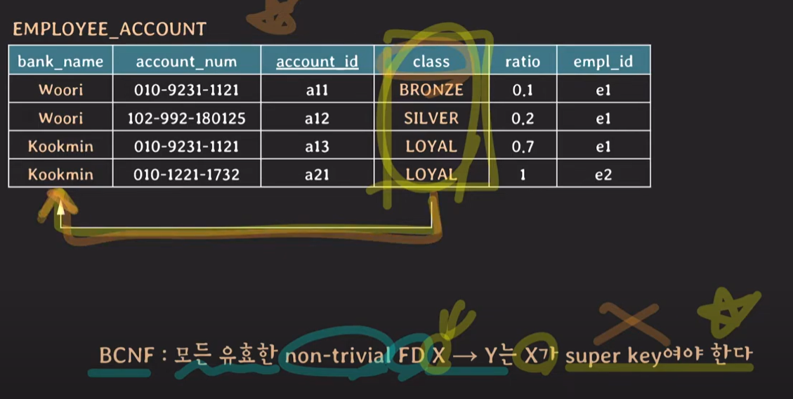 - 정의: 모든 유효한 non-trivial FD X → Y에서 X는 반드시 Super Key여야 함.