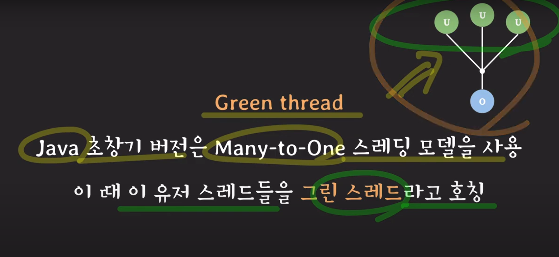 - 여러 유저 스레드 ↔ 하나의 OS 스레드