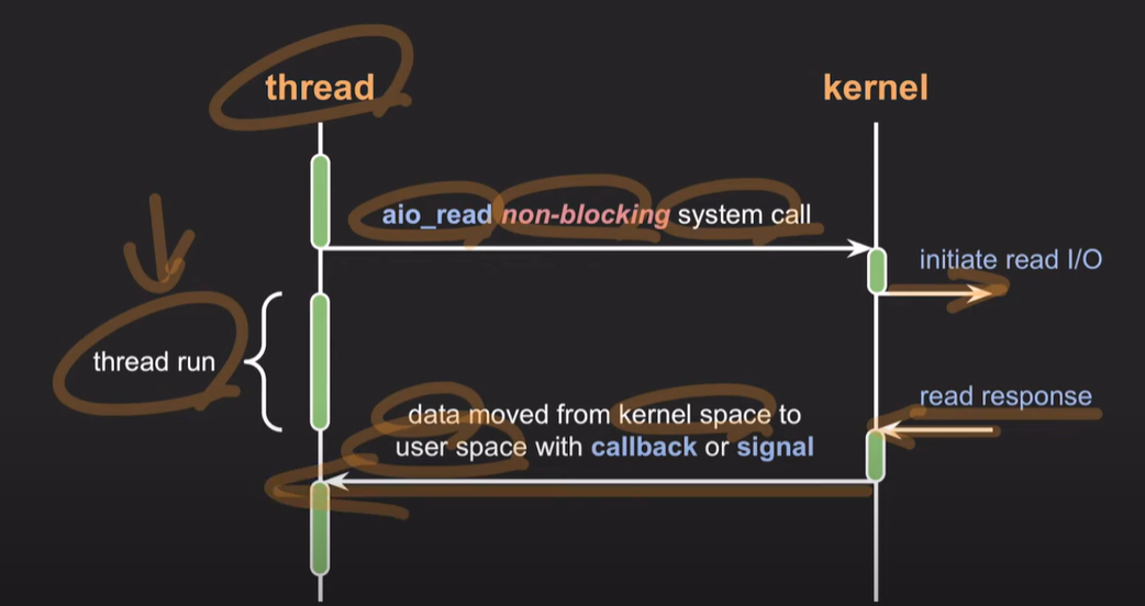① 스레드가 aio_read() 호출 (non-blocking system call)