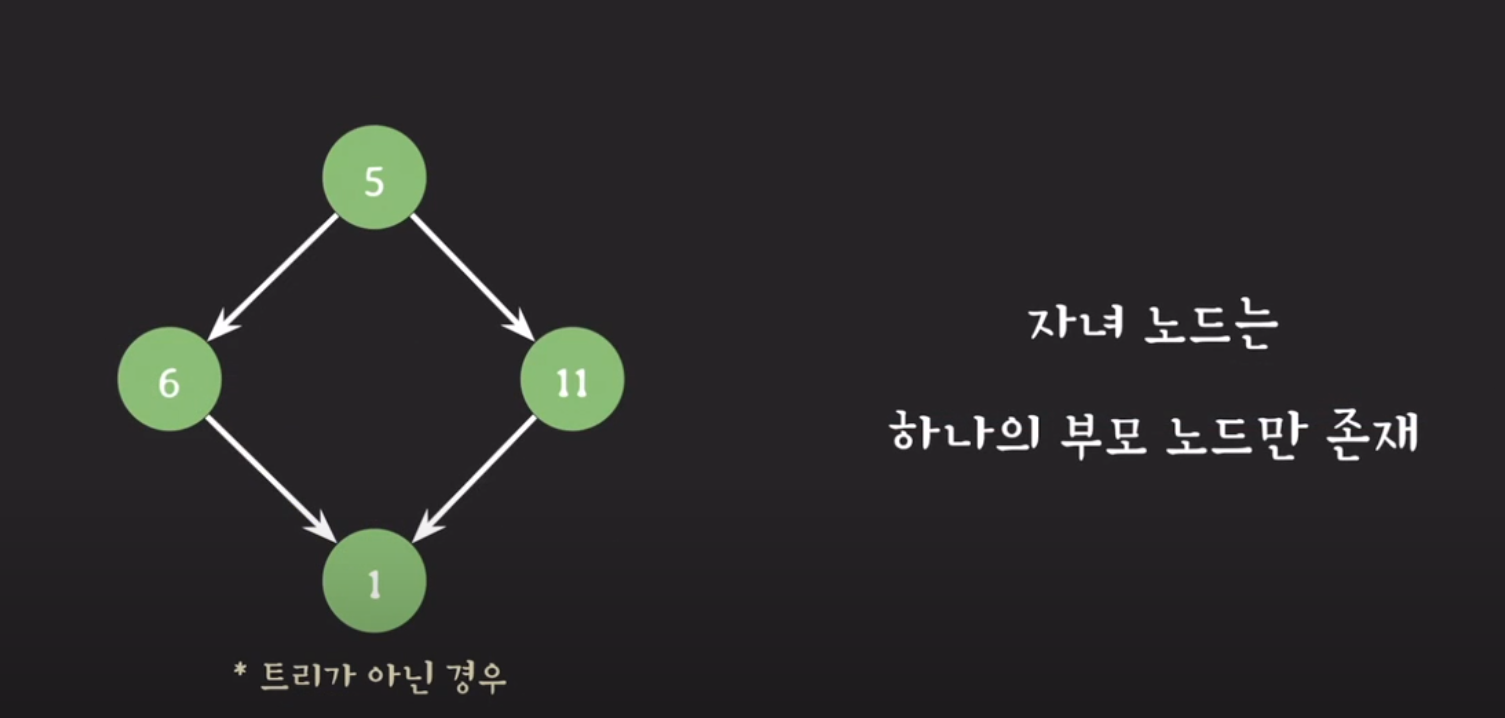 - 하나의 자식 노드는 정확히 하나의 부모를 가진다.