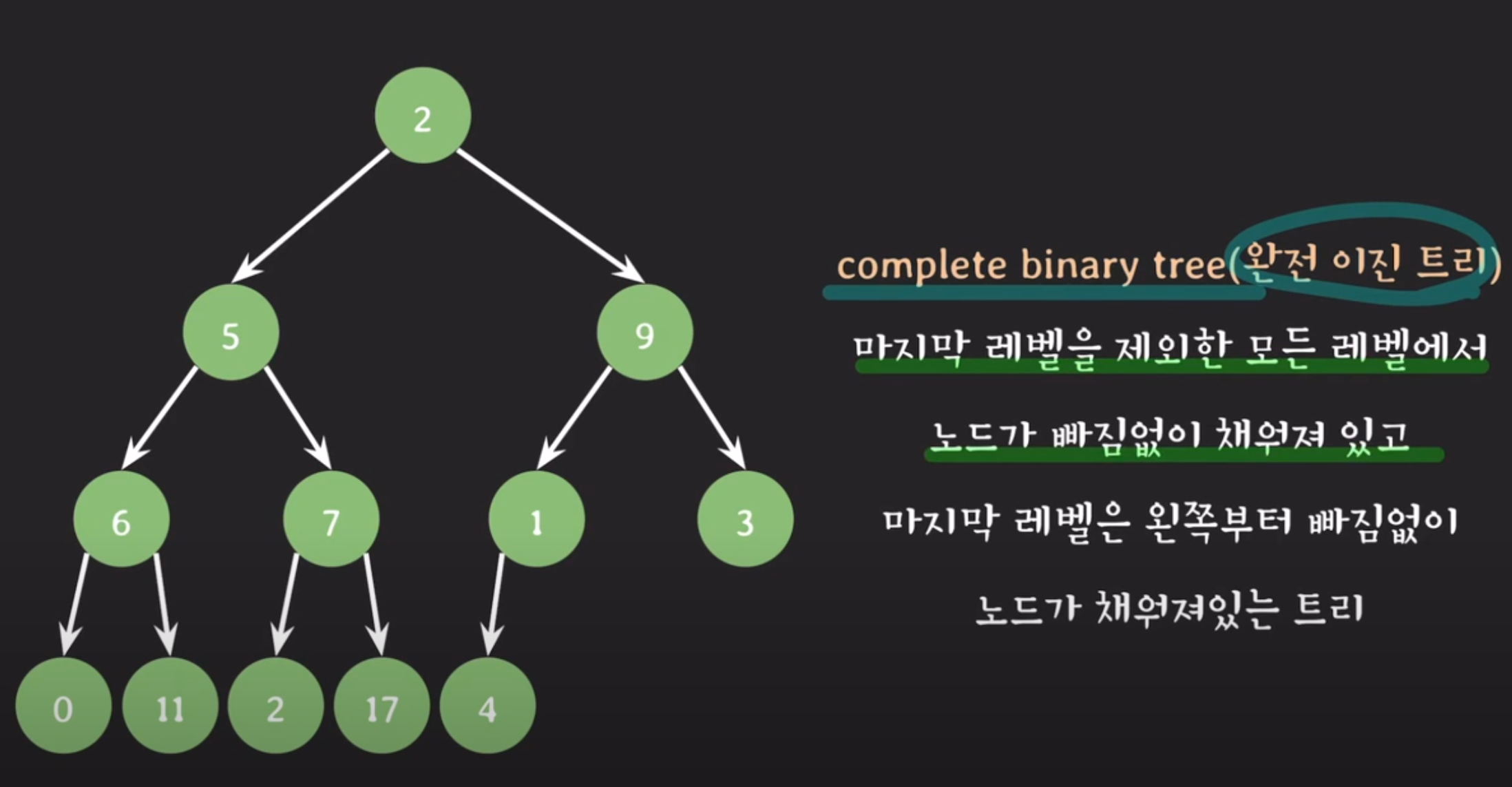 - 마지막 레벨은 왼쪽부터 순서대로 노드가 차 있다.