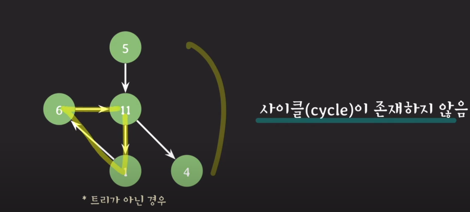 - 트리는 순환(사이클)이 존재하지 않는다.