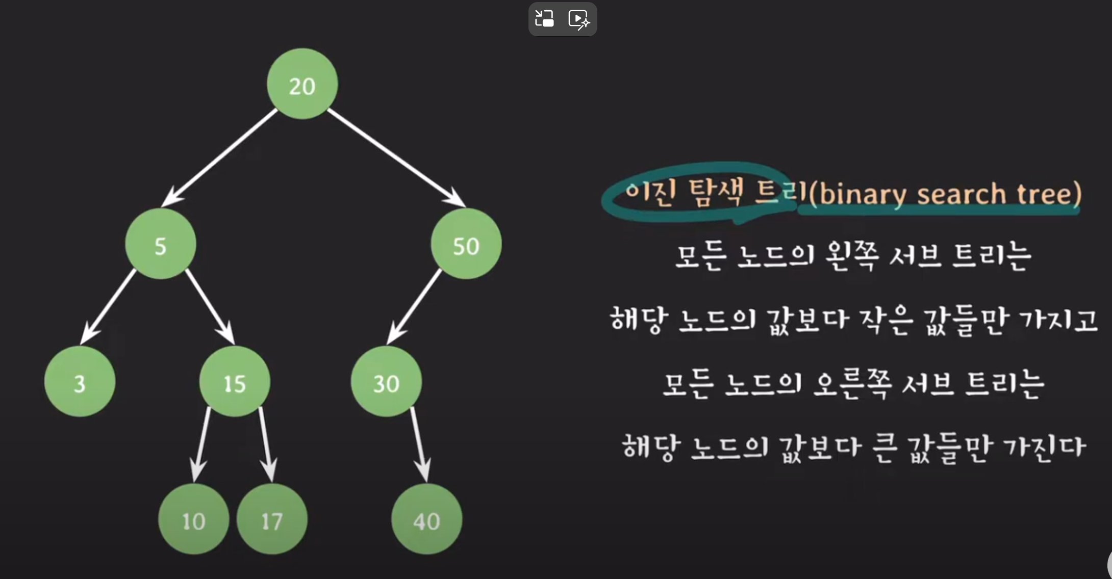 - 모든 노드의 오른쪽 서브트리: 현재 노드의 값보다 큰 값을 가진 노드들로 구성