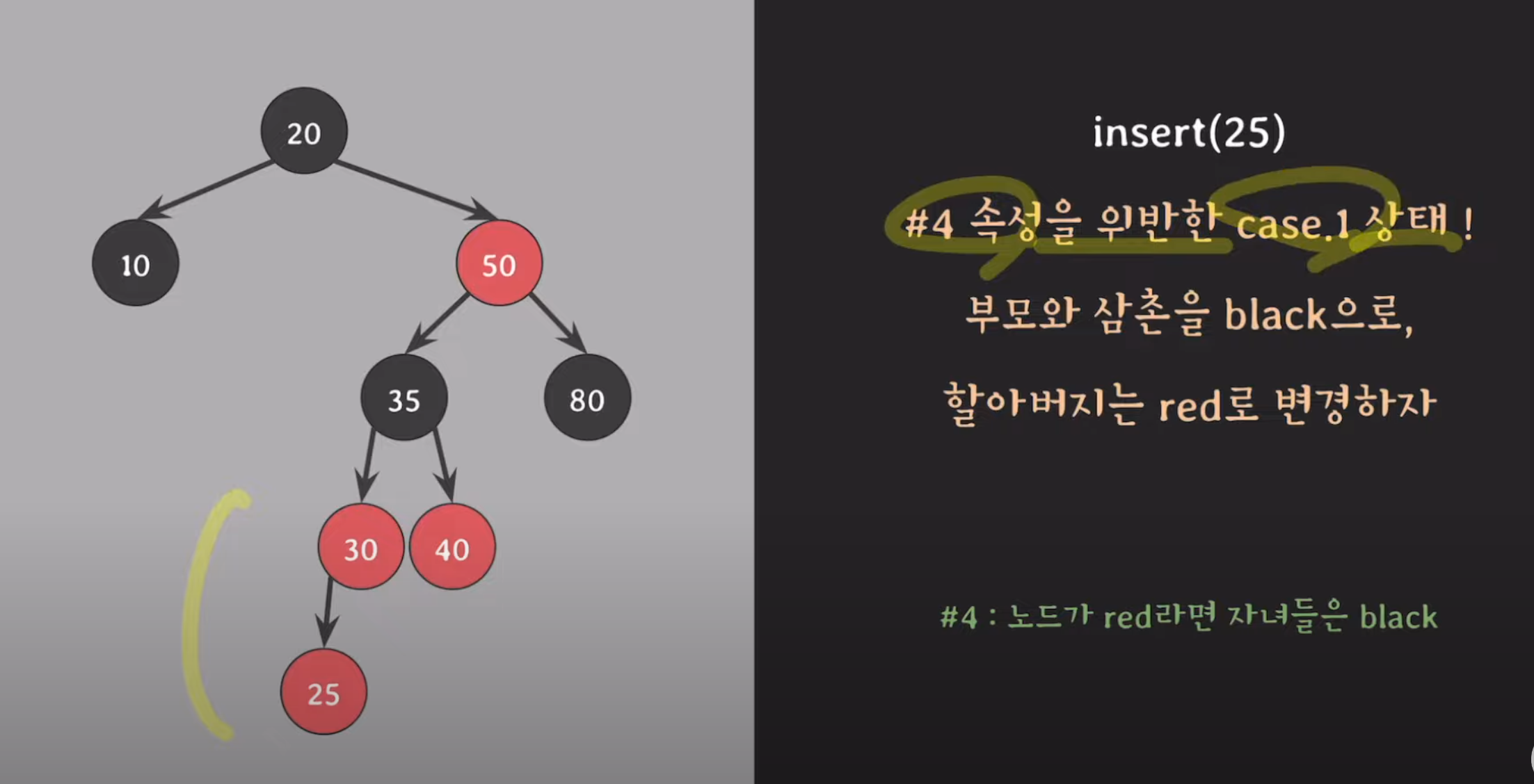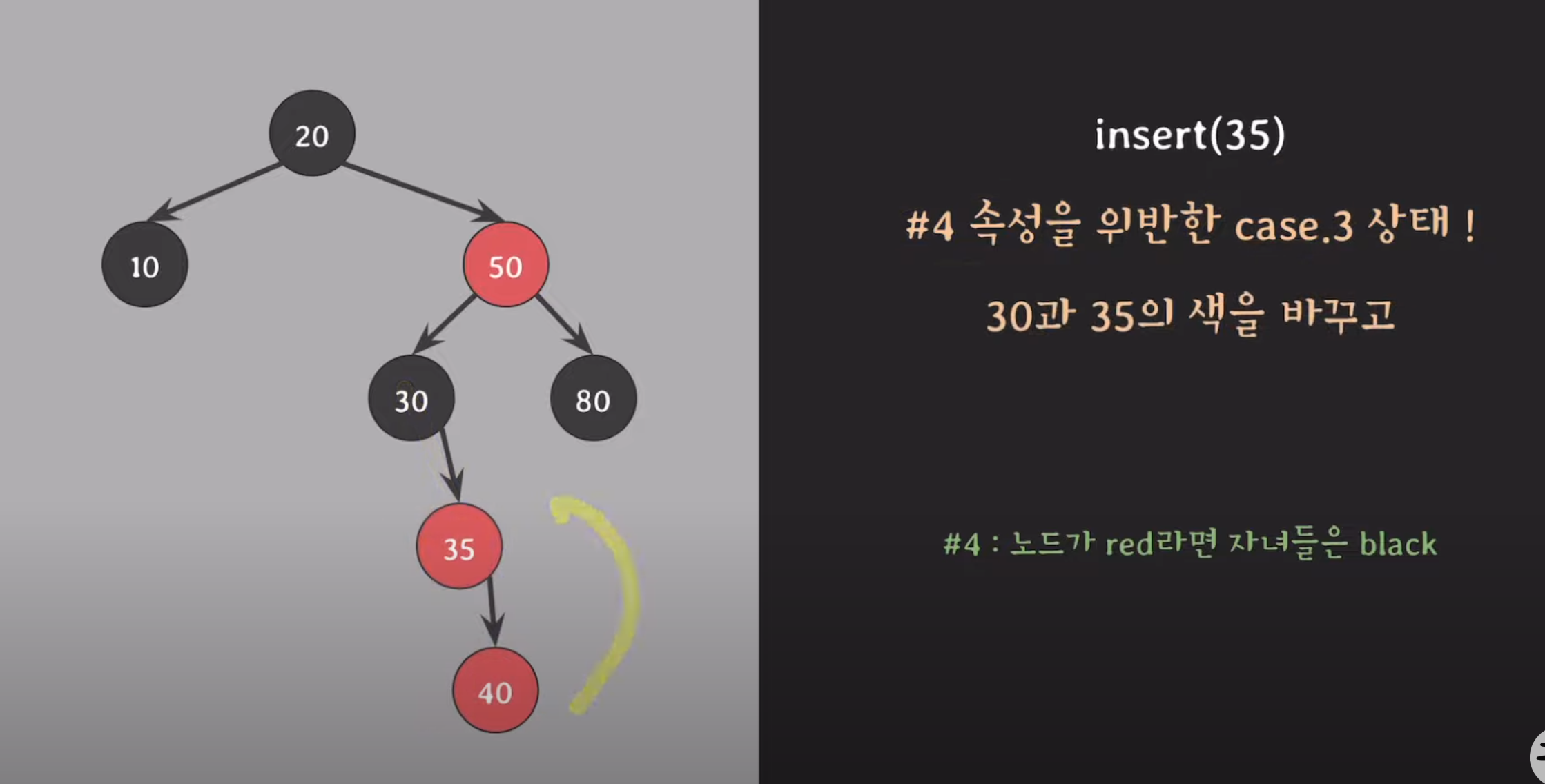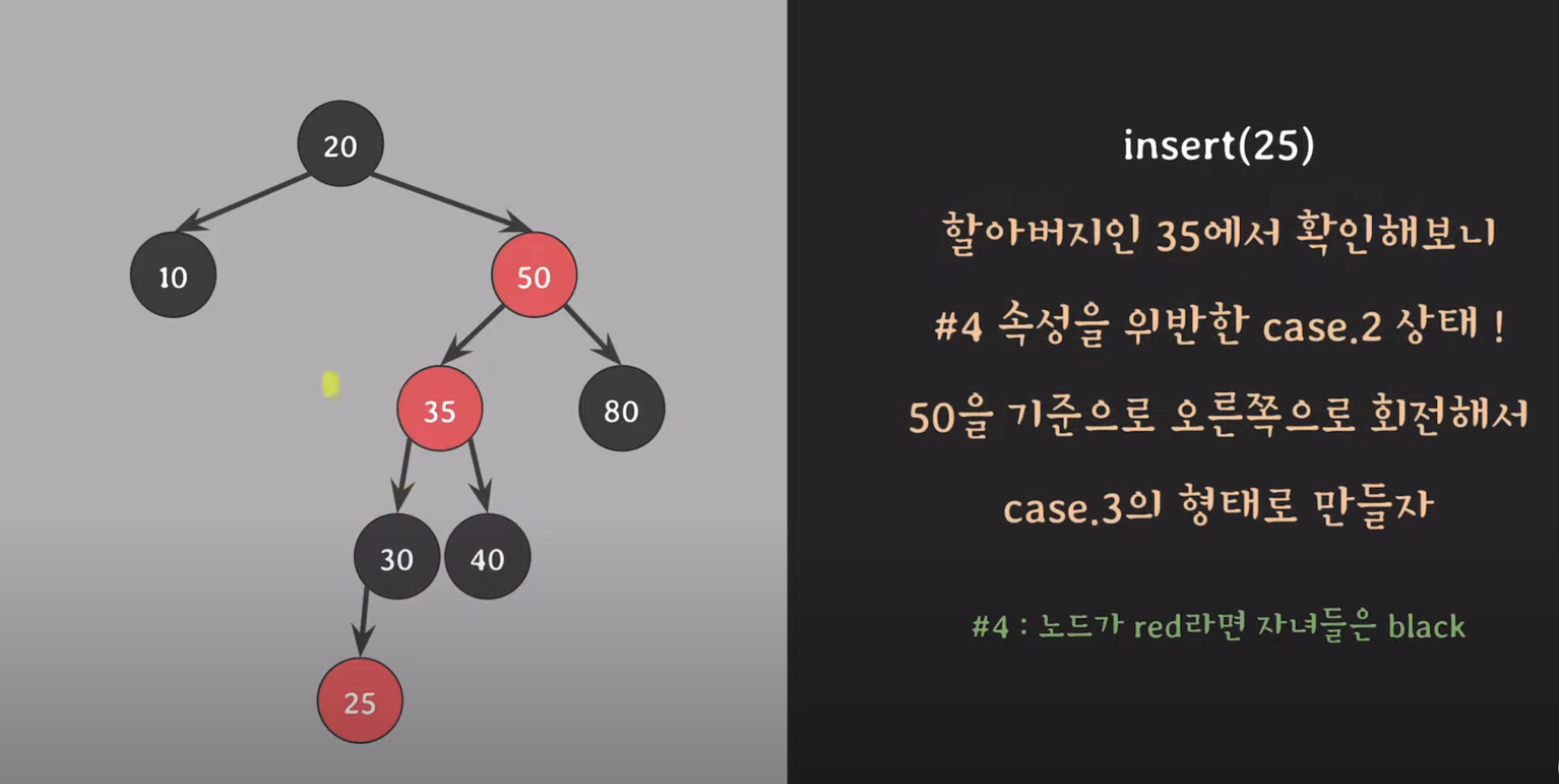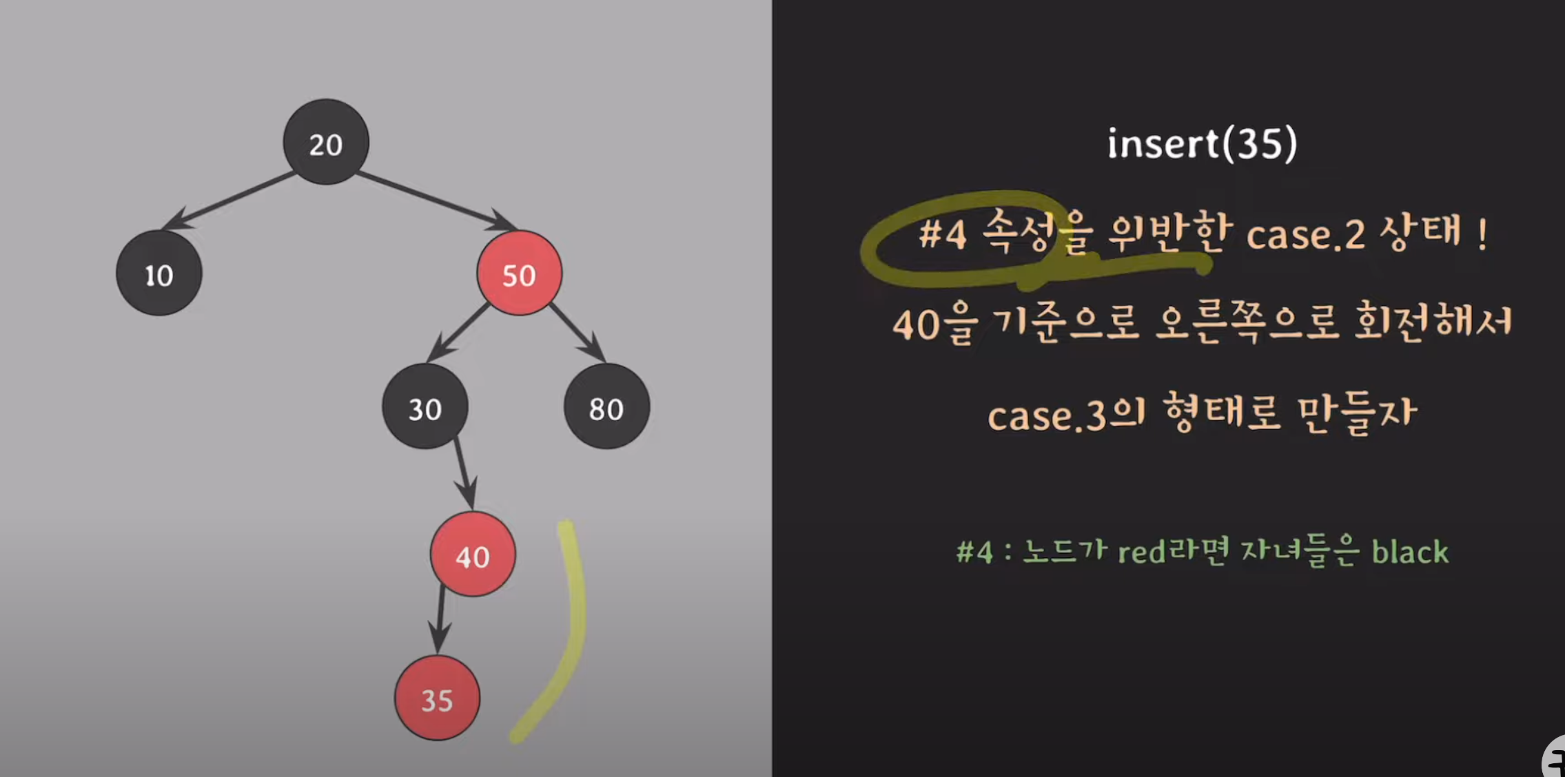 - 예: 부모가 왼쪽 자식, 삽입 노드도 왼쪽 자식