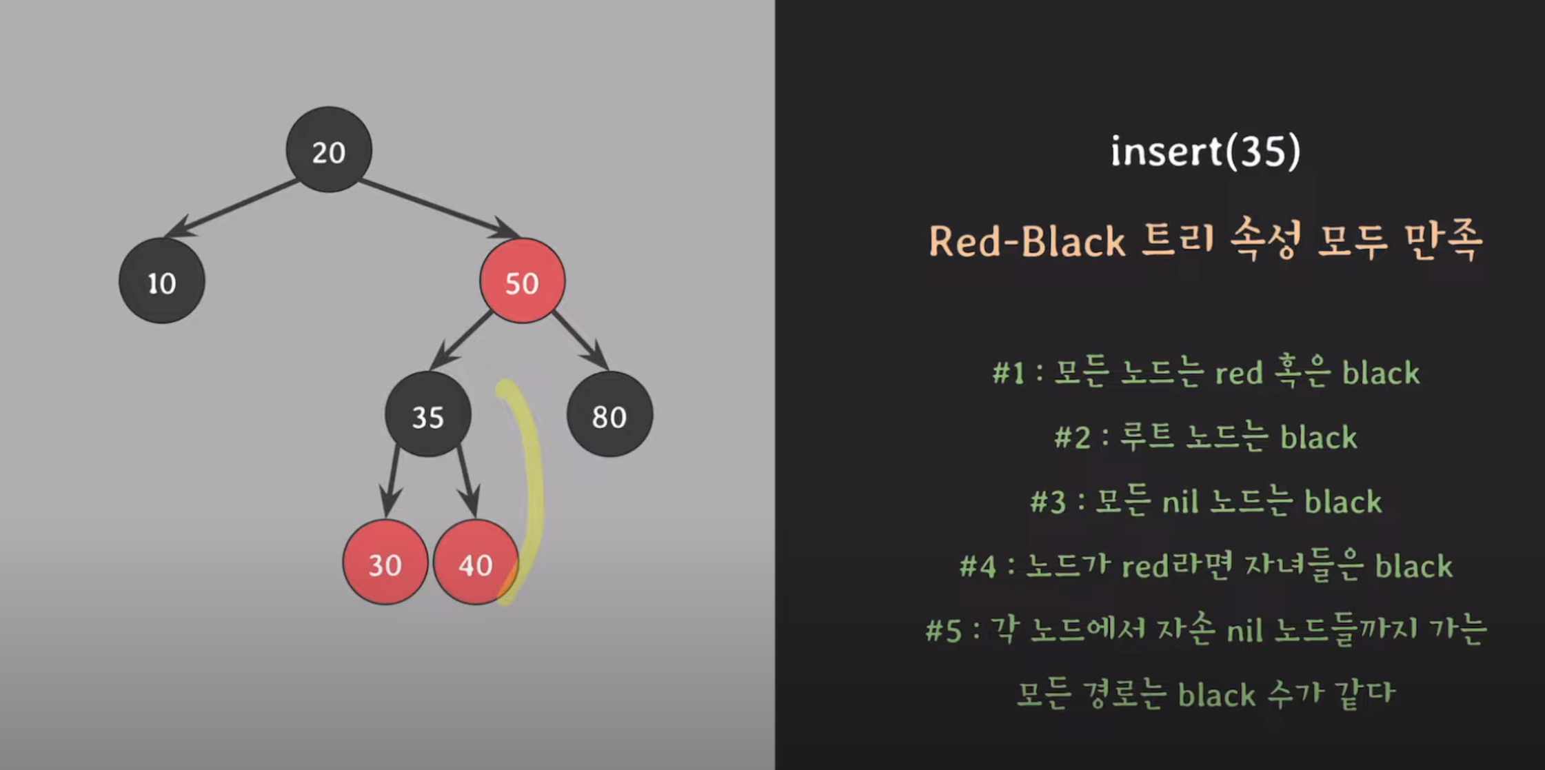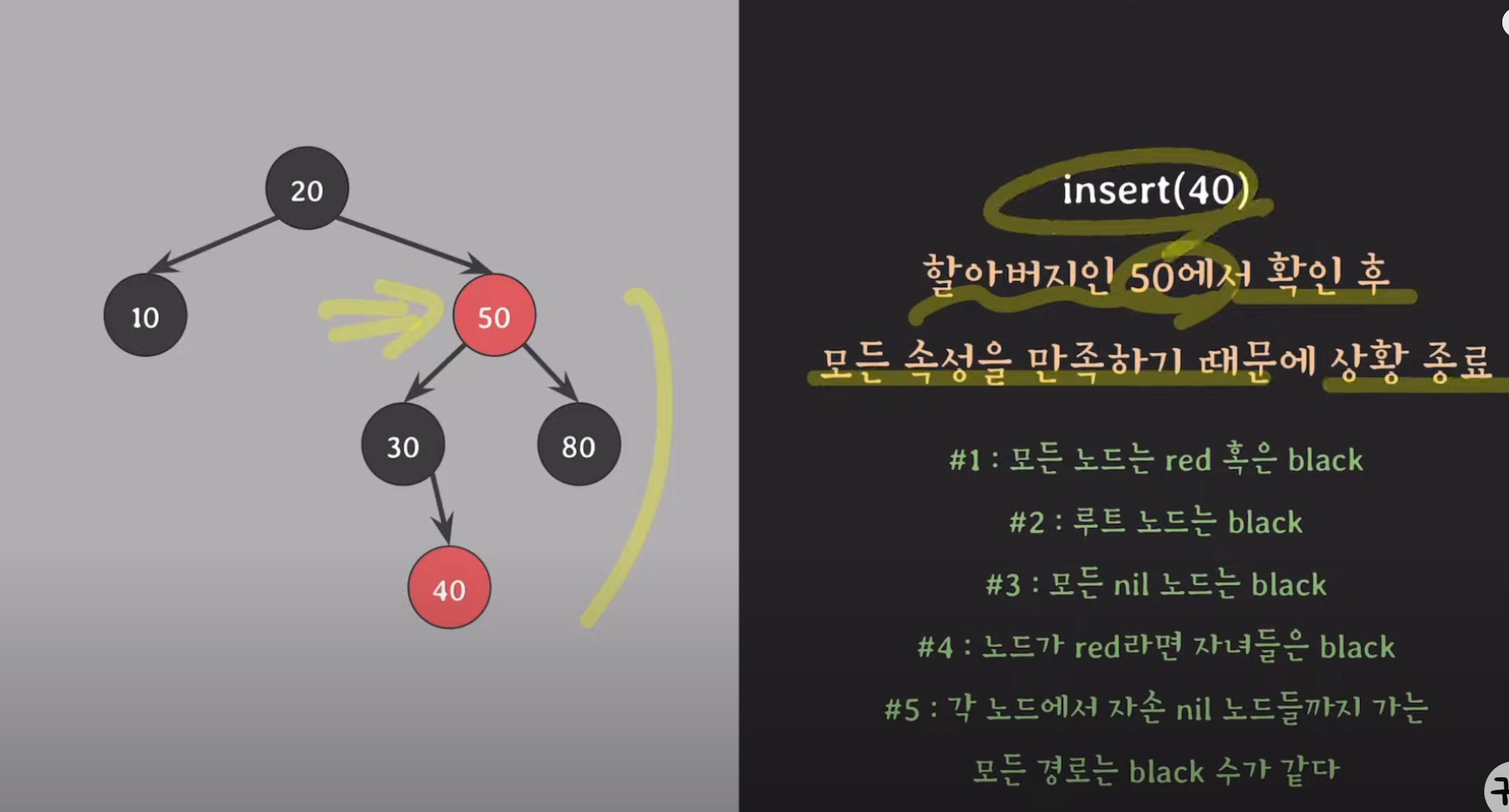 - 모든 경로의 Black Height는 동일해야 하며, 이는 속성 #5의 내용이다.