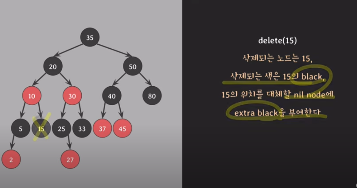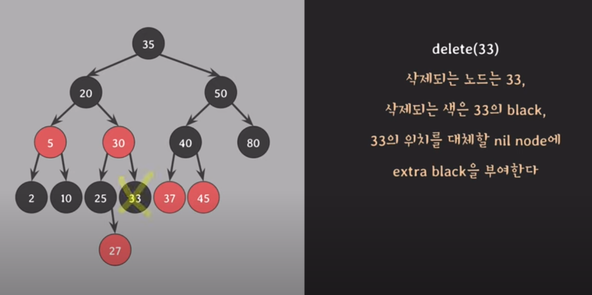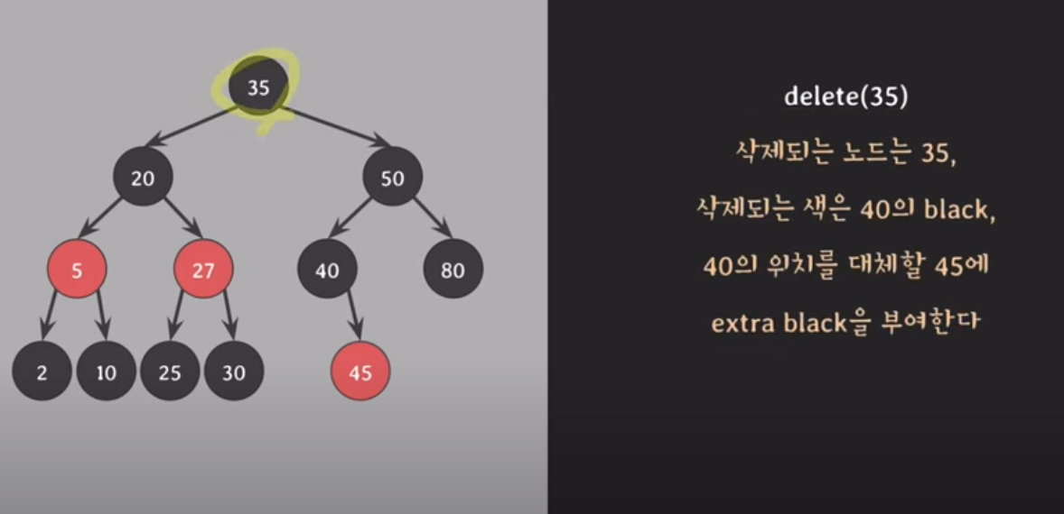 삭제된 위치를 대체한 노드에 "Extra Black(=Double Black)" 이 부여된다.