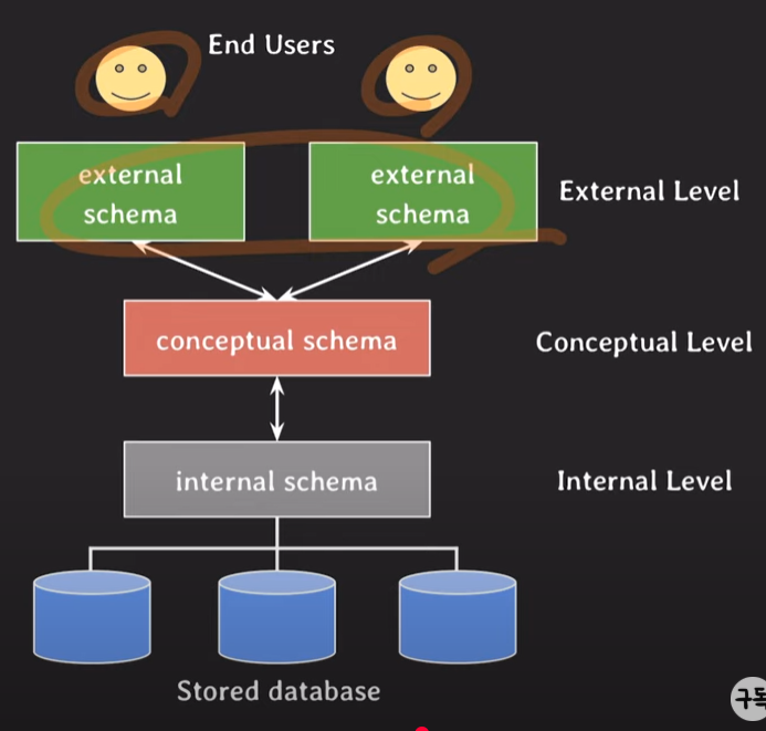- 데이터베이스를 세 가지 계층으로 나누어 각 계층을 독립적으로 관리.