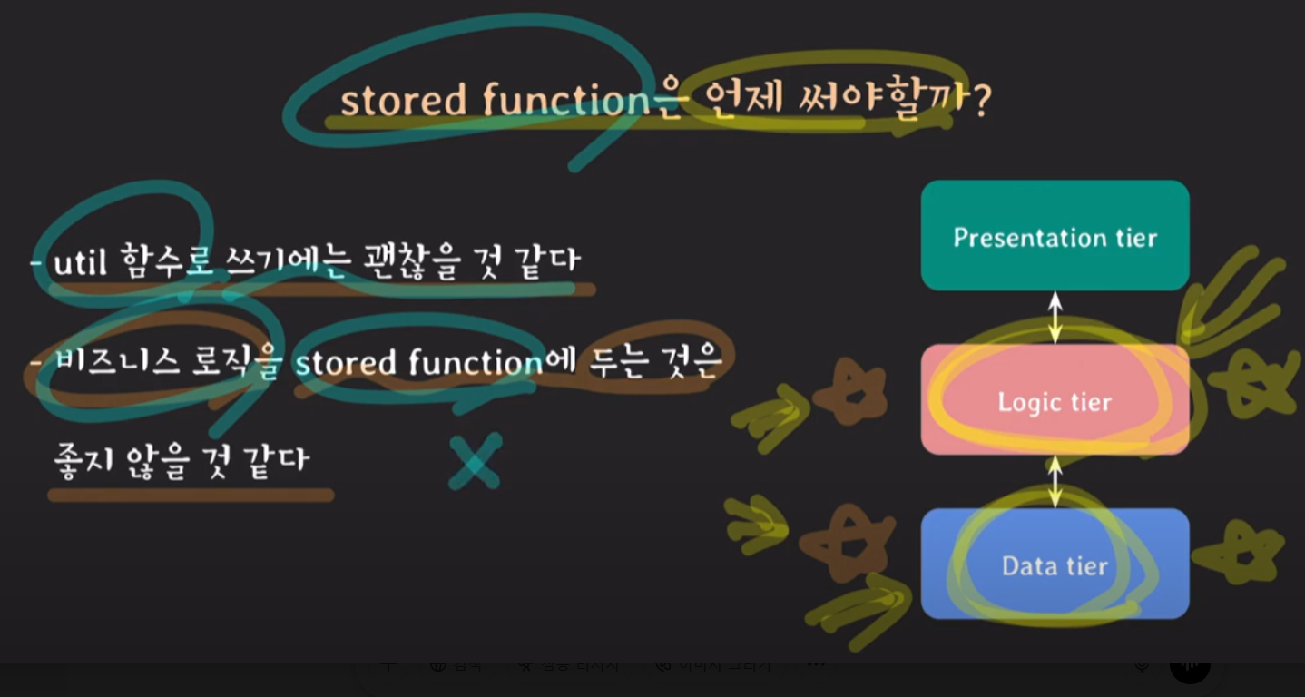 따라서 Stored Function은 데이터 중심 유틸 함수 정도로 제한하는 것이 좋고,